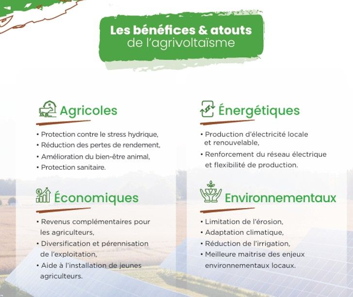 Le photovoltaïque présente l’avantage de pouvoir proposer de très nombreuses solutions dans sa mise en œuvre sur notre territoire. L'agrivoltaïsme permet de produire en synergie des produits agricoles et de l'énergie photovoltaïque sur un même terrain.